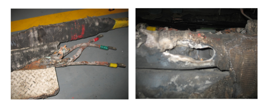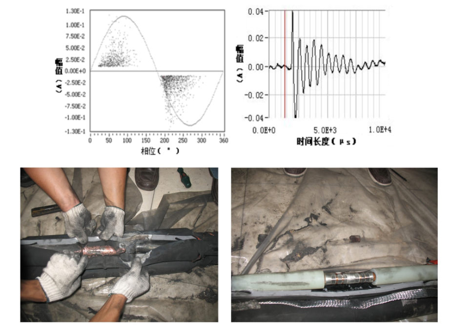 電纜中間接頭有130mV的放電信號,判斷為電纜終端內(nèi)部放電,解剖發(fā)現(xiàn)該處電纜相中間接頭內(nèi)部有放電痕跡。