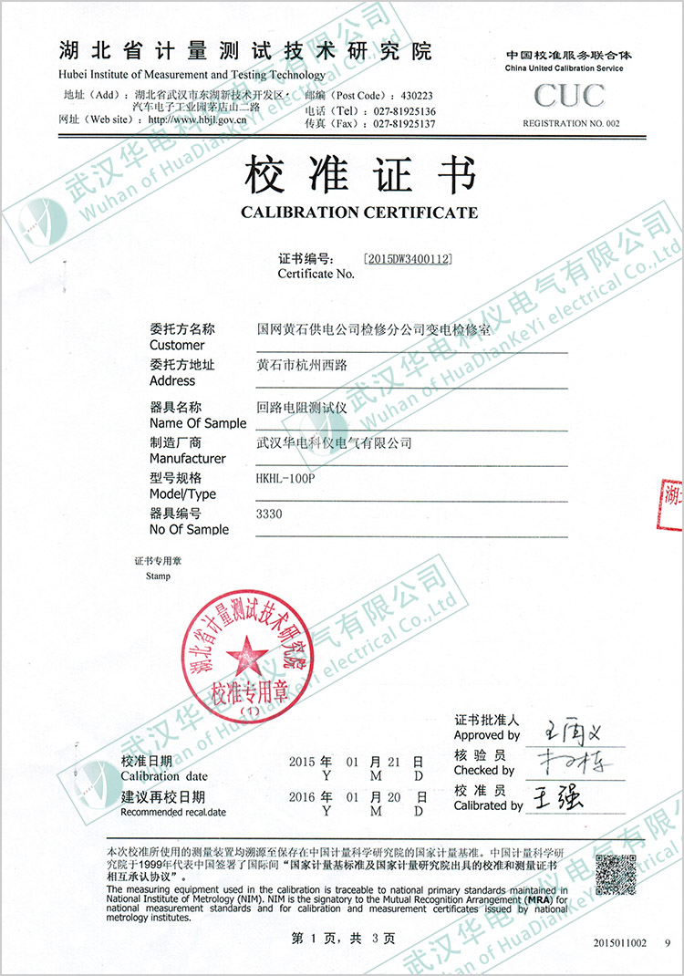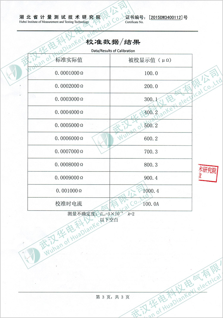 HKHL-100P回路電阻測(cè)試儀校準(zhǔn)證書