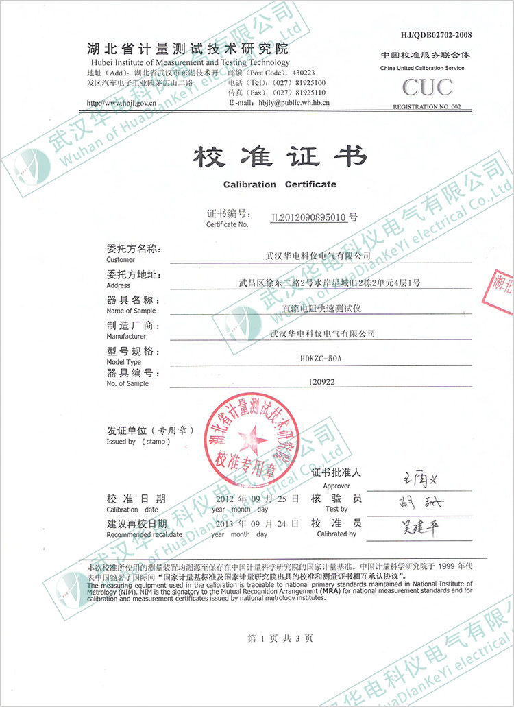 HDKZC-50A直流電阻快速測(cè)試儀校準(zhǔn)證書(shū)