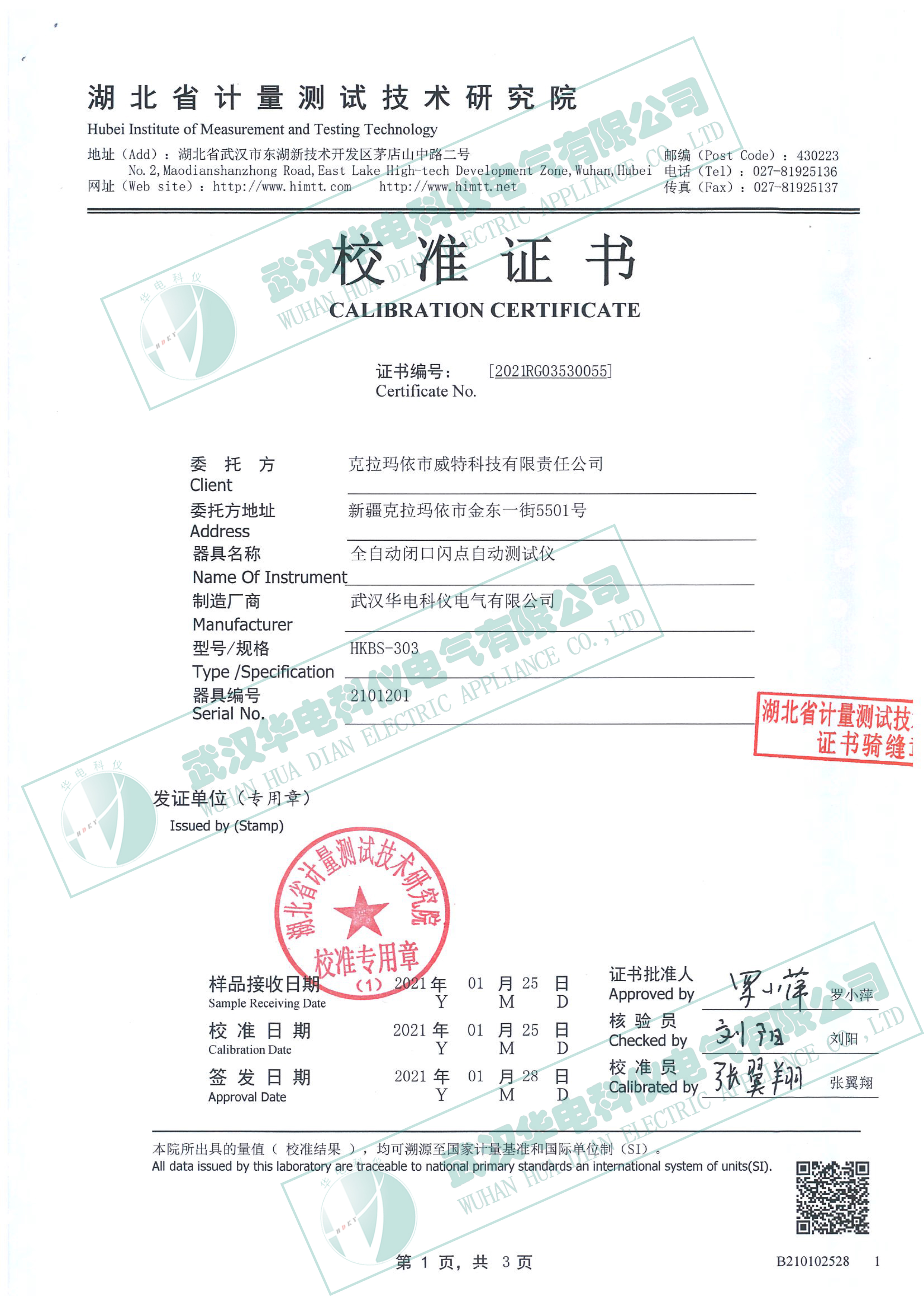 HKBS-303全自動(dòng)閉口閃點(diǎn)自動(dòng)測(cè)定儀校準(zhǔn)證書(shū)