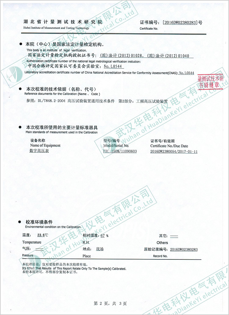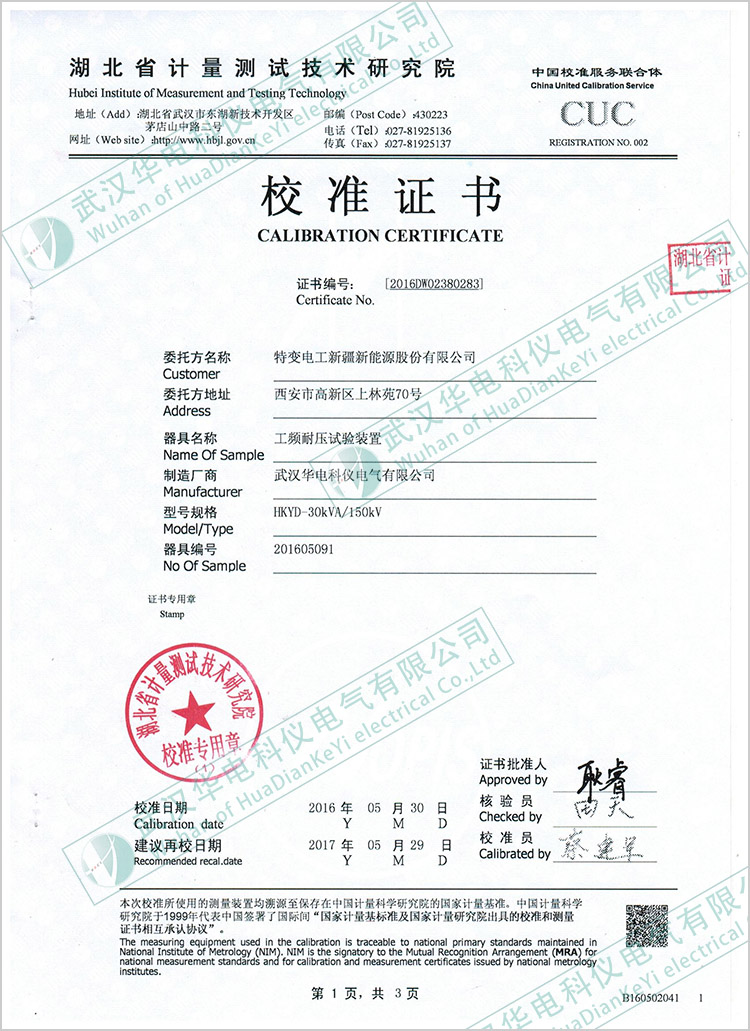 HKXZ-100kva/50kv變頻串聯(lián)諧振耐壓試驗(yàn)裝置校準(zhǔn)證書