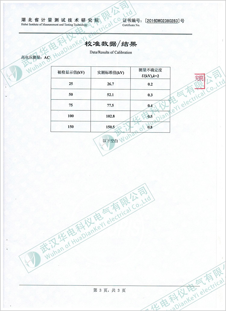 HKYD-30KVA/150KV工頻耐壓試驗(yàn)裝置校準(zhǔn)證書