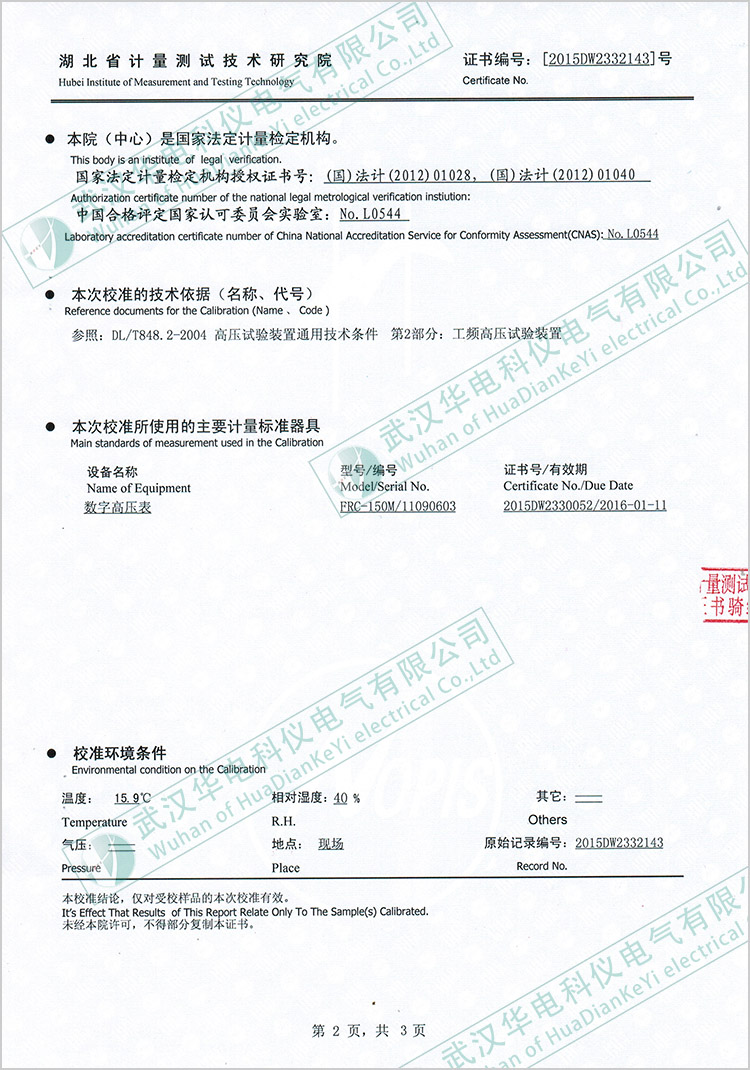 HKYD-30KVA/150KV工頻耐壓試驗(yàn)裝置校準(zhǔn)證書(shū)