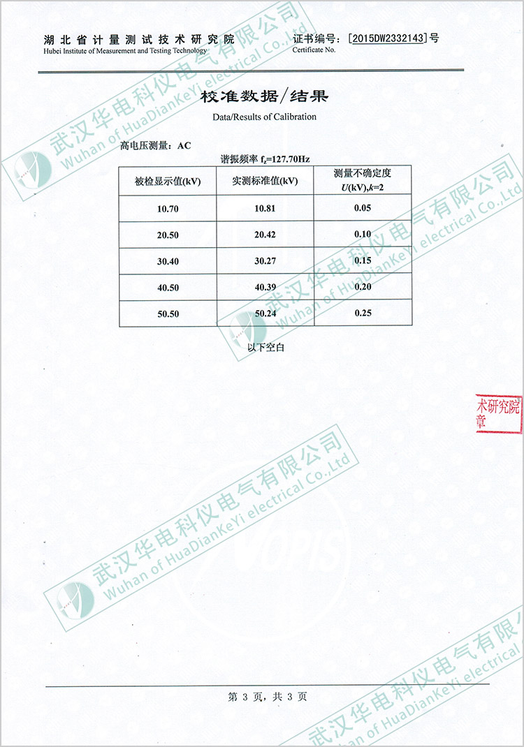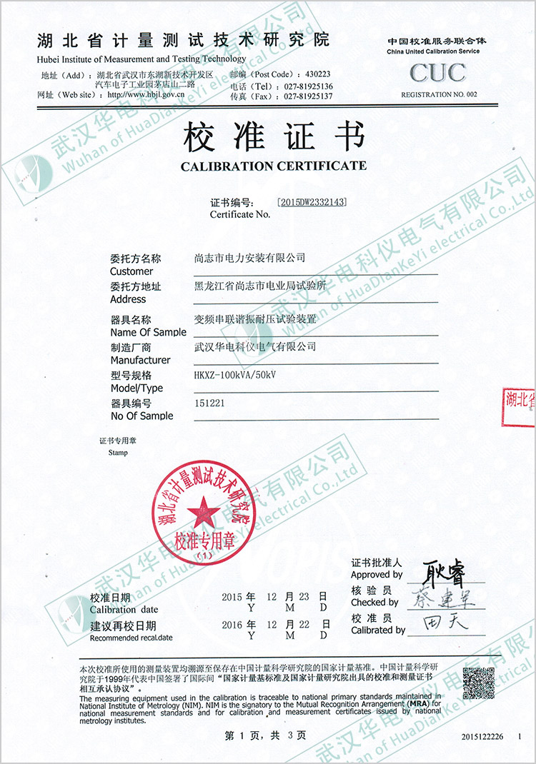 HKXZ-100kva/50kv變頻串聯(lián)諧振耐壓試驗(yàn)裝置校準(zhǔn)證書(shū)