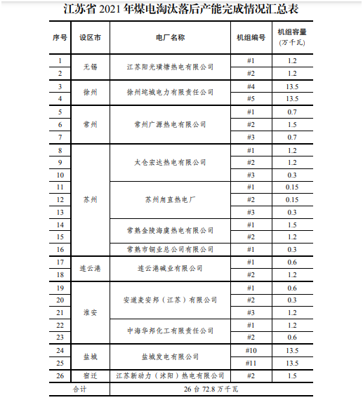 26臺(tái)!2021年江蘇省電力行業(yè)淘汰落后產(chǎn)能公示
