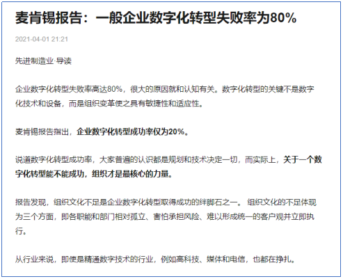 綜上所述,企業(yè)數(shù)字化轉型是典型的自上而下的組織文化變革過程,且企業(yè)與企業(yè)之間因戰(zhàn)略導向存在著差異性。同類企業(yè)雖然客觀環(huán)境定位趨同,但因其發(fā)展戰(zhàn)略的差異,其數(shù)字化轉型所依托的組織文化差異較大。因此,企業(yè)在數(shù)字化轉型過程中,務必高度關注以業(yè)務架構為基礎的組織文化建設與統(tǒng)籌。在此截取麥肯錫報告的一小部分內(nèi)容以供參考。見下圖: