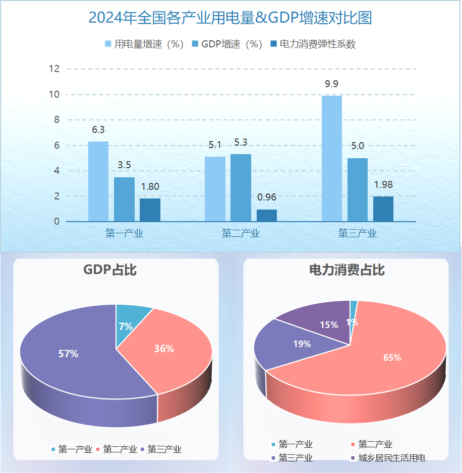 2024年,第一產(chǎn)業(yè)的用電量和GDP均保持穩(wěn)定的增長(zhǎng)態(tài)勢(shì),第二產(chǎn)業(yè)的GDP增速和全社會(huì)用電量均居于首位,第三產(chǎn)業(yè)的用電量增速、電力消費(fèi)彈性系數(shù)、GDP總量均占據(jù)領(lǐng)先地位,城鄉(xiāng)居民生活用電在整體電力消費(fèi)中占有重要地位,且需求量持續(xù)增長(zhǎng)。具體情況見(jiàn)下圖: