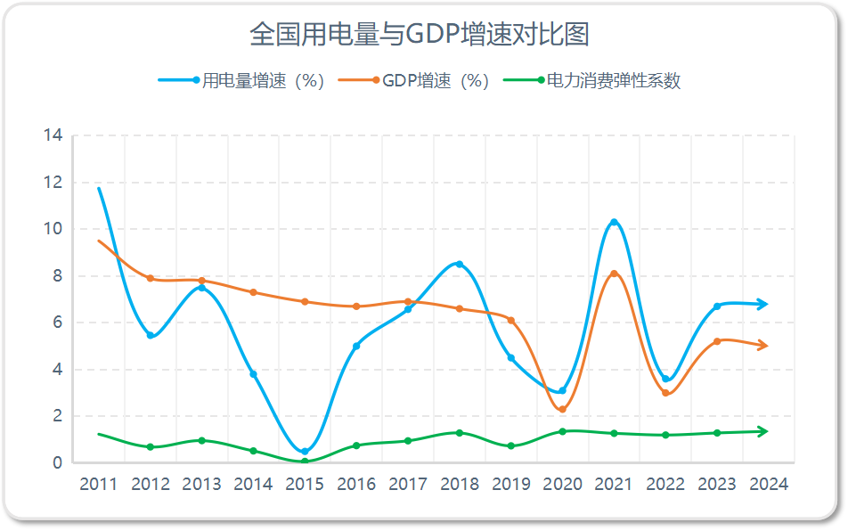 據(jù)統(tǒng)計(jì),2024年,全國(guó)GDP首次突破130萬(wàn)億元,達(dá)到1349084億元,增長(zhǎng)5.0%;全國(guó)全社會(huì)用電量98521億千瓦時(shí),同比增長(zhǎng)6.8%。同時(shí),包括第一、二、三產(chǎn)在內(nèi)的全國(guó)全行業(yè)用電量自2020年以來(lái)增長(zhǎng)了29.5%,“十四五”以來(lái)年均增長(zhǎng)率達(dá)到6.7%。