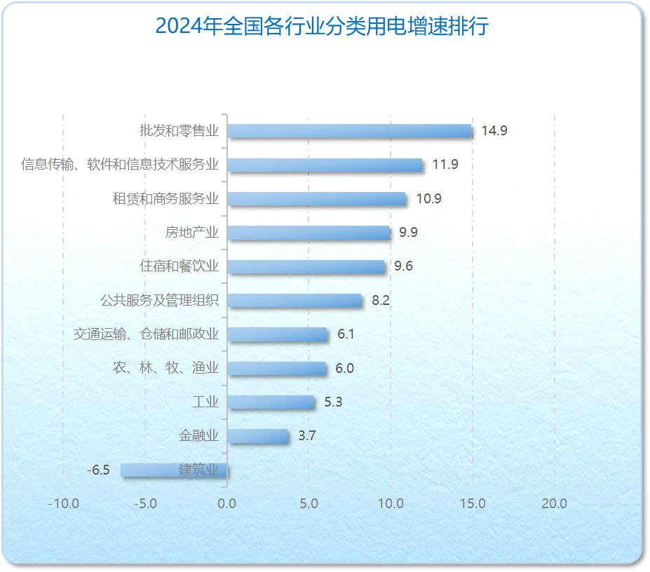 2024年,批發(fā)和零售業(yè)(14.9%)、信息傳輸/軟件和信息技術(shù)服務(wù)業(yè)(11.9%)、租賃和商務(wù)服務(wù)業(yè)(10.9%)這三個(gè)行業(yè)的全年用電量同比增速處于10%~15%,建筑業(yè)是唯一用電量負(fù)增長(zhǎng)的行業(yè),增長(zhǎng)率為-6.5%。各行業(yè)分類用電增速排行如下:
