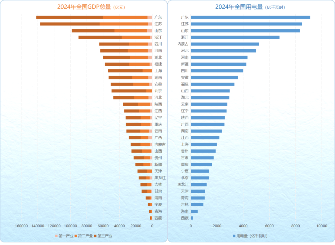 2024年,全國(guó)GDP總量和用電量均居前4位的省份依舊是廣東、江蘇、山東和浙江,西藏居于末位。