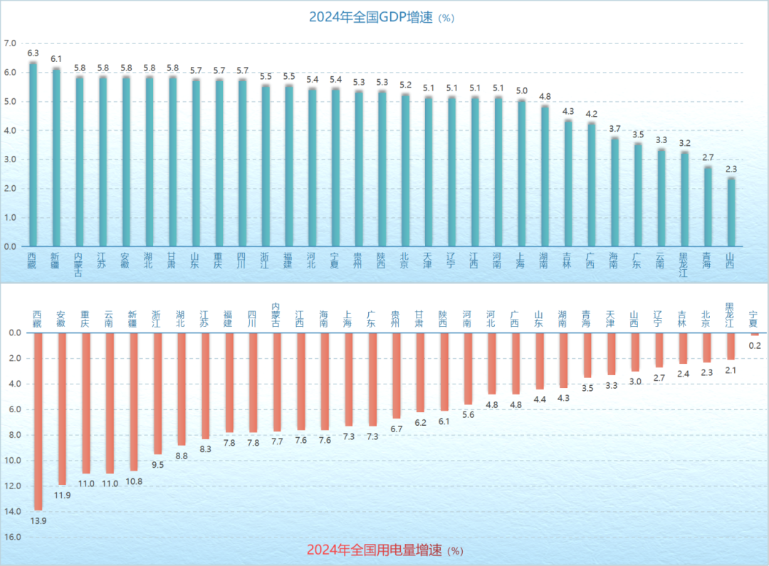 2024年全國(guó)各省GDP和用電量增速排行