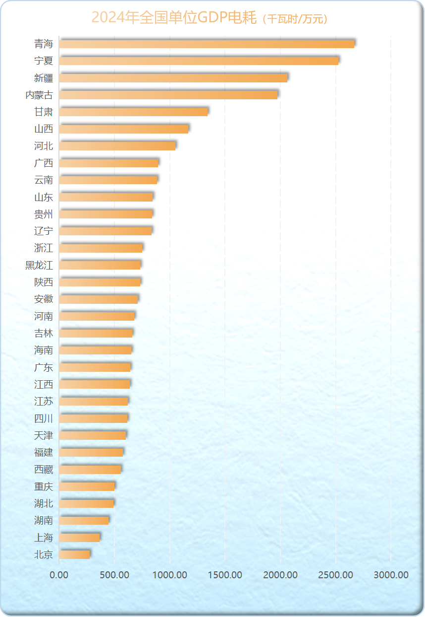2024年,16個(gè)省份的單位GDP電耗低于全國(guó)平均值(730.28千瓦時(shí)/萬(wàn)元)。北京單位GDP電耗最低,為278.67千瓦時(shí)/萬(wàn)元。青海最高,達(dá)到2667.82千瓦時(shí)/萬(wàn)元。各省單位GDP的電耗排行如下: