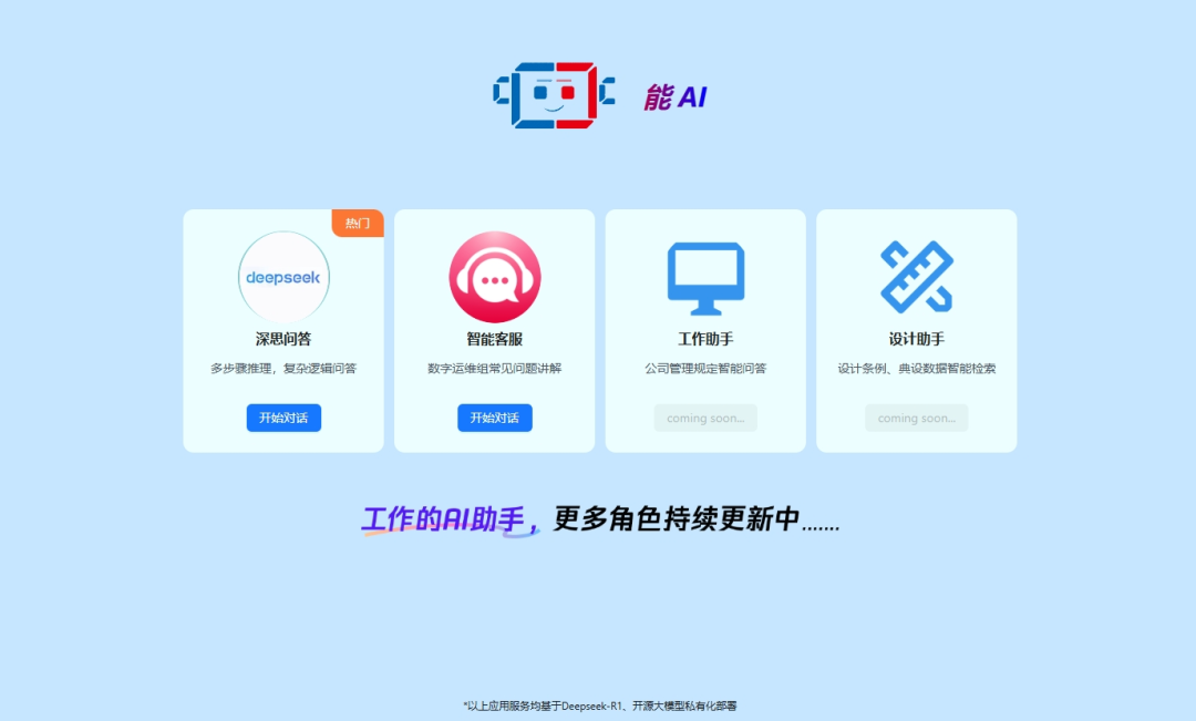 公司成功完成DeepSeek-R1(6710億參數(shù)大模型)及系列輕量化蒸餾模型的私有化部署,將AI能力融入內(nèi)部環(huán)境,賦能公司辦公、管理、業(yè)務(wù)、運(yùn)維與知識庫,實現(xiàn)了深思問答、智能客服、工作助手、設(shè)計輔助等功能。