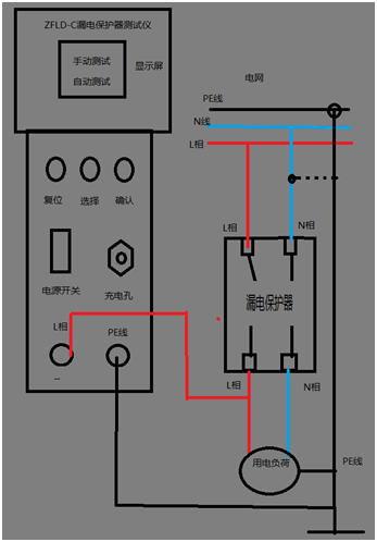 接線特別提示:在對(duì)三相漏電保護(hù)器進(jìn)行測(cè)試時(shí),認(rèn)真的檢查接線正確,確保儀器接線端子L相和漏電保護(hù)器輸出的L相連接,儀器的接線端子PE接到供電設(shè)備保護(hù)線PE或保護(hù)器輸入端N相。