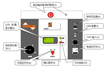 儀器輸出端,為測(cè)量故障和耐壓試驗(yàn)提供穩(wěn)定可靠的高壓,操作時(shí),應(yīng)使用專用的高壓線,并套上高壓帽。保護(hù)接地應(yīng)接高壓輸出線外鎧。