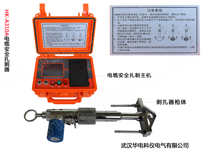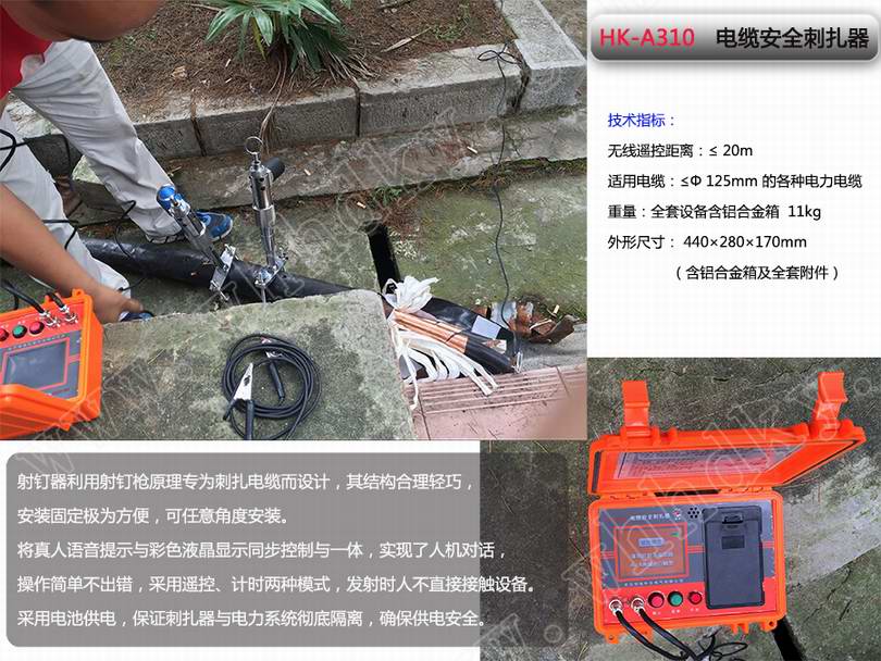 HK-A310 電纜安全刺扎器采用非接觸式控制(遙控、計(jì)時(shí))解決了人工刺扎的人身安全問(wèn)題;采用電池供電使本產(chǎn)品用電與電力系統(tǒng)徹底隔離,保證了電力系統(tǒng)的安全。