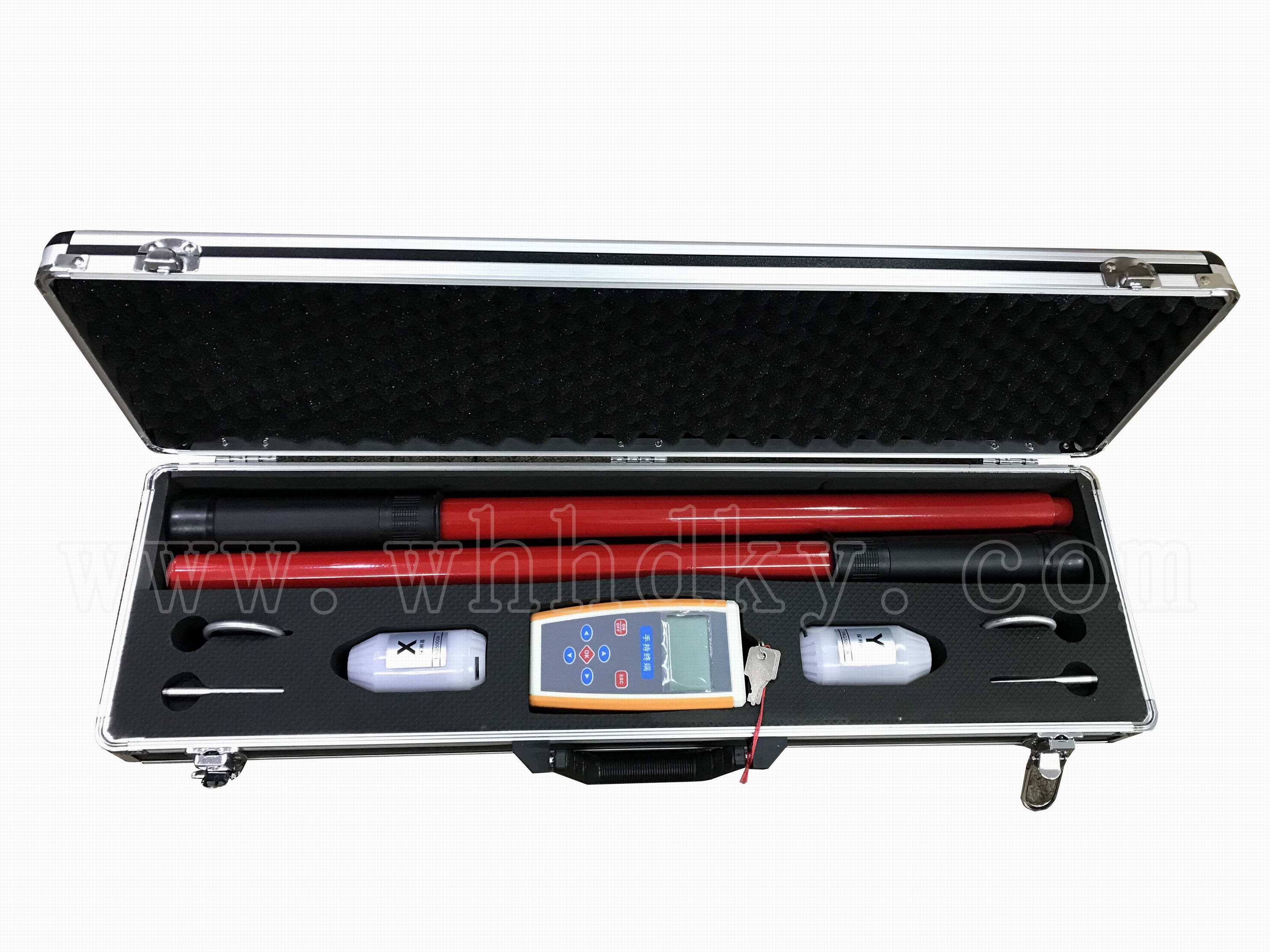 TAG8000A無線高壓核相儀由三個部分組成: 兩個電壓檢測和發(fā)射的聯(lián)合裝置(包括絕緣桿), 一個是無線接收裝置, 兩個發(fā)射裝置分別將采樣到的電壓數(shù)據(jù)信號通過高頻發(fā)射裝置發(fā)送至接收端, 接收端根據(jù)發(fā)射器發(fā)射的信號進行相應的處理并通過LCD顯示相位關系和兩線路的頻率, 同時接收器語音播放測試結(jié)果。