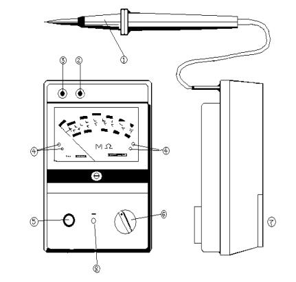 ①測(cè)試探頭 ②接地保護(hù)端 ③地端 ④指示高低范圍發(fā)光二極管 ⑤測(cè)試按鈕⑥功能開(kāi)關(guān) ⑦電池蓋板 ⑧充電型直流電源插孔(2520 此處為電池檢測(cè))