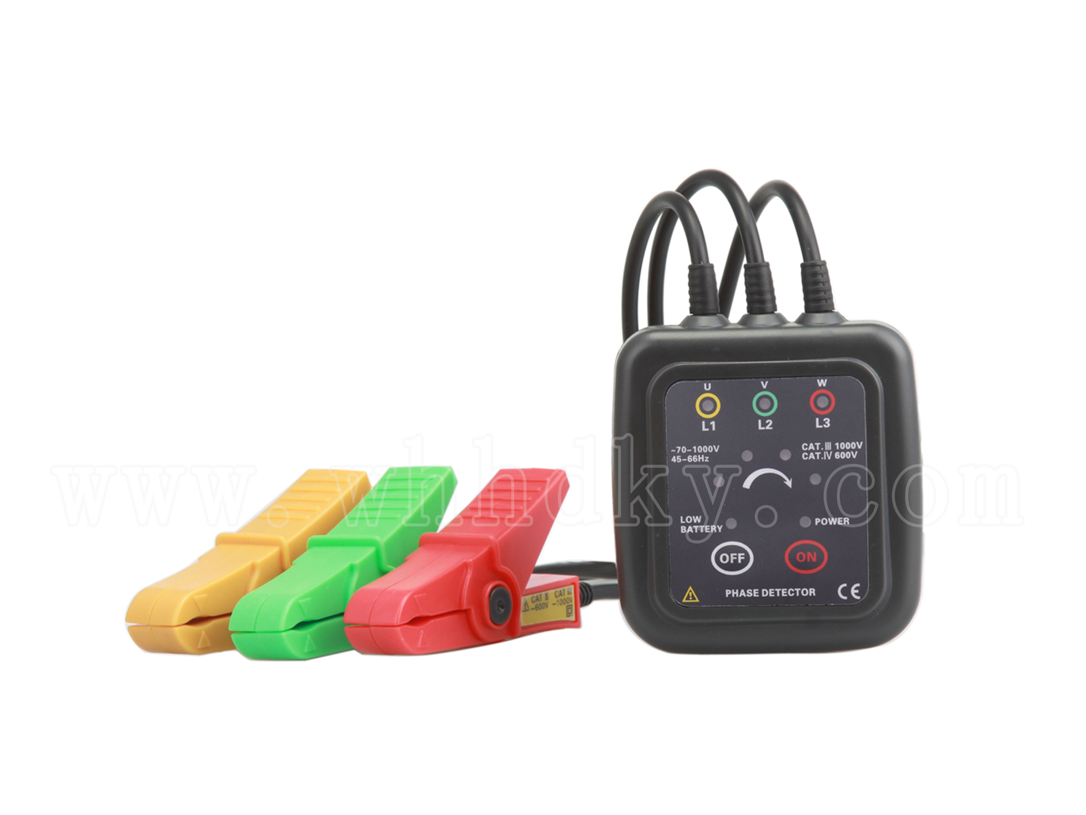 1. 采用鉗形非接觸感應式測量,不用剝開電纜線外皮,無需接觸高壓裸露火線,直接將三個超感應高絕緣鉗夾分別夾住三相火線的絕緣外皮即可檢測相序。